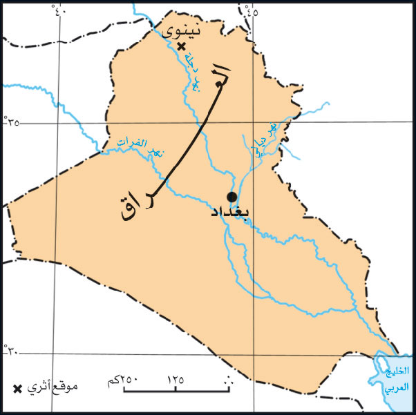 نينوى Ninua كما يرد اسمها في النصوص المسمارية إحدى المدن القديمة ذات التاريخ الطويل في شمالي العراق، وكانت العاصمة الأخيرة للامبراطورية الآشورية حتى سقوطها في عام 612ق.م، موقعها اليوم هو منطقة تلية واسعة بشكل شبه منحرف غير منتظم في الجانب الأيسر من مدينة الموصل في شمالي العراق، على بعد نحو كيلومتر واحد إلى الشرق من نهر دجلة. ويبدو أن دجلة كان يجري بمحاذاة السور الغربي للمدينة في الألف الأول قبل الميلاد على أقل تقدير. ويأخذ السور الخارجي للمدينة القديمة حالياً شكل سلسلة تلال يبلغ طولها نحو 12كم، وتحيط بالموقع الذي تصل مساحته إلى 720 هكتاراً تقريباً. ويحيط بالموقع من الجهتين الشمالية والشرقية منخفض موازٍ لبقايا السور الخارجي، وهذا المنخفض يمثل موضع الخندق الدفاعي.