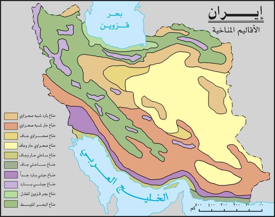 المناخ: يسود المناخ شبه المداري القاري معظم الأراضي الإيرانية، في حين يسود المناخ المداري الهوامش الجنوبية. فالصيف حار والشتاء مائل إلى البرودة، ومتوسط درجة الحرارة في كانون الثاني ـ2 درجة مئوية في الشمال و15 درجة مئوية في الجنوب. أما في تموز فيرتفع متوسط درجة الحرارة في الشمال إلى 25 درجة مئوية، وفي الجنوب إلى 31 درجة مئوية. أما كمية الهطل فتراوح في معظم الأقاليم الداخلية بين 50مم، و500مم، ويهطل المطر في الشتاء والربيع، أما على المنحدرات الساحلية لجبال إلبورز فيرتفع معدل الهطل إلى 1000-2000 مم في السنة.