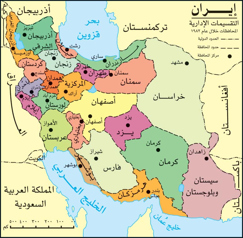 إيران Iran دولة آسيوية اسمها الرسمي «الجمهورية الإسلامية الإيرانية»، وتعرف أيضاً باسم بلاد فارس Persia. تقع في الجزء الجنوبي الغربي من قارة آسيا. يحدها شمالاً تركمنستان وأذربيجان وأرمينية بحدود طولها (1740كم) وبحر قزوين (630كم)، ومن الشرق أفغانستان (850كم)، والباكستان (830كم)، ومن الغرب العراق (1280كم) وتركية (470كم)، ومن الجنوب الخليج العربي وخليج عُمان والمحيط الهندي (1880كم). تبلغ مساحة إيران 1.648 مليون كم2. كان عدد سكانها 20.1 مليون نسمة (1960) ووصل عام 1997 إلى نحو 60.929.000 نسمة.