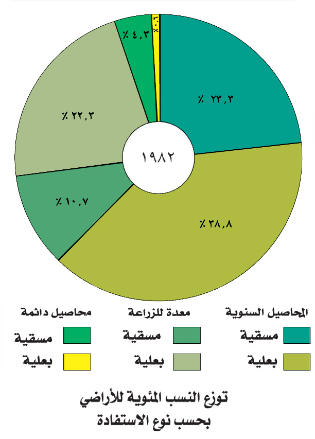 1ـ الزراعة: يعمل في الزراعة نحو 80٪ من السكان. وتعدّ إيران من البلاد الزراعية، فمجموع الأراضي المعدة للزراعة بلغ 6.209 ملايين هكتار (1.999 مسقية و4.210 بعلية) من مجموع الأراضي القابلة للزراعة والبالغة 15.4 مليون هكتار (1995). لذلك فإن مساحة الأراضي المزروعة لا تزيد كثيراً على 25% من مساحة البلاد، لذلك كان لابد من توزيع الأراضي وخاصة غير المستغلة منها على الفلاحين. كما وزعت أراضي أملاك الدولة والأراضي المصادرة من الأشخاص الفارّين من البلاد والموالين لنظام الشاه السابق. فبين عامي 1980 و1984 تم توزيع 611.1 ألف هكتار على الفلاحين وهذا يعادل 3٪ من مساحة الأراضي الزراعية. وقد ارتفع عدد التعاونيات الزراعية إلى 3072 تعاونية، وتم توزيع 3.282 مليون طن من الأسمدة الكيماوية في جميع أنحاء البلاد عام 1982 مقابل 1.544 عام 1977. وبلغ عدد الجرارات الزراعية 93 ألف جرار و2400 حصادة. وقد قسّمت الأراضي الزراعية حسب النوع والاستفادة إلى المساحات المخصصة للمحاصيل السنوية وتشغل 62.1٪، والمعدة للزراعة وتبلغ 33٪ ومساحات المحاصيل الدائمة وتشغل 4.9٪.
