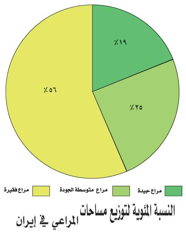2ـ تربية الحيوان: يعمل في تربية الحيوانات القبائل البدوية والريفيون ويملك البدو وأنصاف البدو 70٪ من مجموع الحيوانات في إيران. وتربى الحيوانات في محافظات خراسان وكردستان ولورستان وعربستان وغيرها من المحافظات في جنوبيّ البلاد. أما في بقية المناطق فيعمل المزارعون في كل مكان تقريباً. وتربى قطعان الحيوانات على نباتات المراعي على مدار العام، وتساعد في ذلك المساحة الواسعة للمراعي في إيران، حيث تقدر بنحو 10 ملايين هكتار منها 19٪ مراع جيدة، و25٪ متوسطة الجودة، و56٪ فقيرة. وفي فصل الشتاء تنحصر تربية القطعان في الأودية والسهول السهبية، أما في الصيف فعلى السفوح الجبلية. وتتعرض الحيوانات إلى آفات تنقلها القوارض، ومنها الطاعون، وكذلك الجفاف والجليد مما يسبب خسارة كبيرة للبلاد.