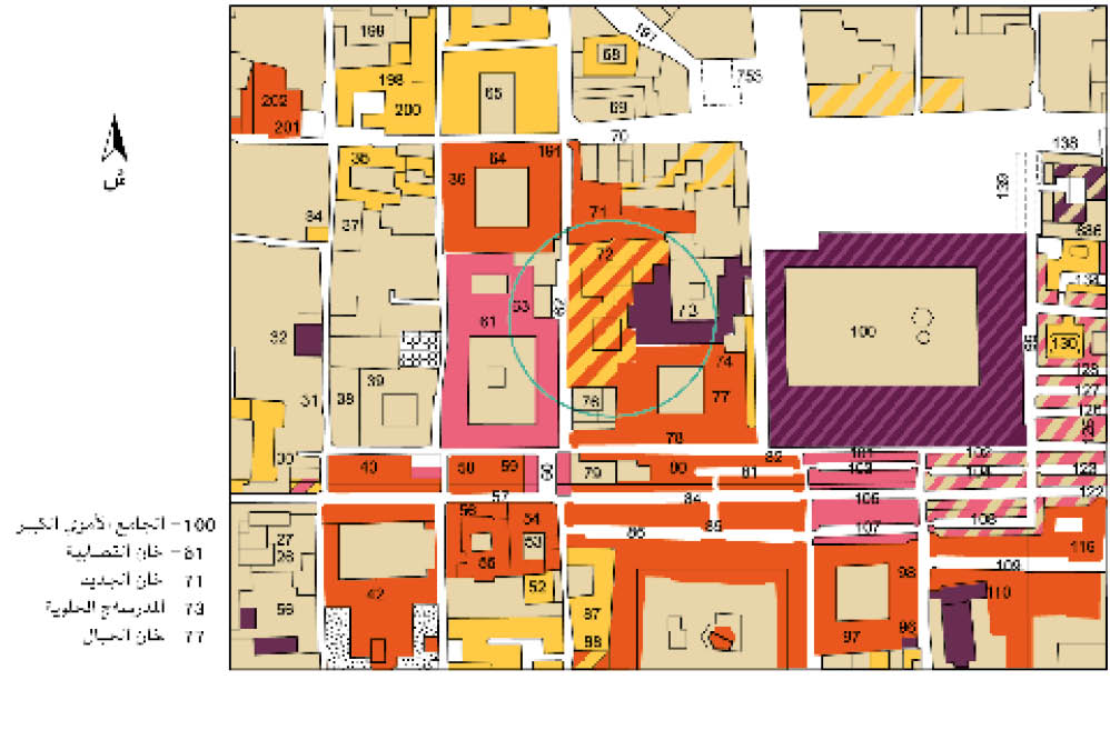 وأمّا الخان فمسقطه مستطيل الشكل، غير أن ضلعه الشرقية تتدرّج بدءاً من ضلعه الكبيرة الشمالية إلى ضلعه الصغيرة الجنوبية. وهو يحتوي على فناءين: شمالي واسع شبه مستطيل، وجنوبي صغير مربع الشكل. ويتم الدخول إلى الخان عبر مدخل غربي من سوق خان الحرير يؤدي مباشرة إلى الفناء الشمالي، والذي يتمّ الانتقال منه إلى الفناء الجنوبي عبر عقد حجري. ويتركز مسجد الخان عند الفناء الواسع الذي تتوزع حوله وحول الفناء الصغير في الطابق الأرضي المحالّ التجارية لتكون أماكن لعرض البضائع التجارية، وبجانبها المستودعات والخدمات الملحقة؛ كالحمام والفرن والمطبخ إضافة إلى الإصطبل. وأمّا الطابق العلوي فقد كان فندقاً، يحوي غرفاً متعددةً لمبيت التجار البنادقة وغيرهم من التجار الأوربيين، إضافة إلى المرافق الضرورية للسكن.
