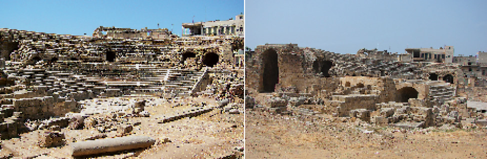 - أعمال دائرة آثار جبلة في التنقيب والترميم في مسرح جبلة.