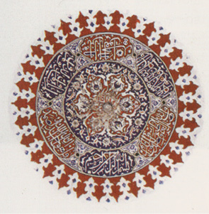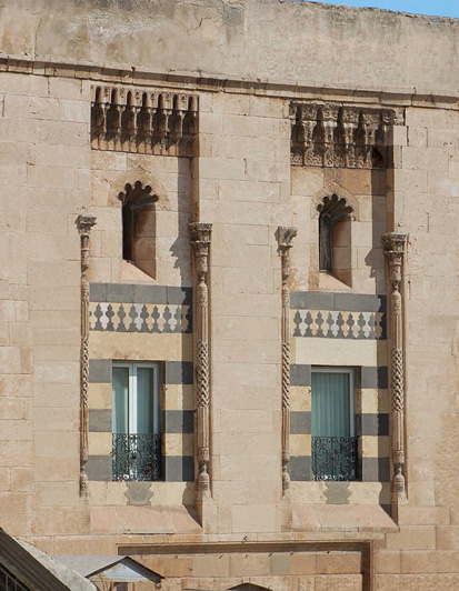 وتحت النافذة مزررات بالألوان: الأصفر والأسود والأبيض، يليها إلى الأسفل نافذة مستطيلة ضمن جدار بنظام الأبلق، وهناك على الطرفين عمودان ملتحمان بالجدار يضم بدنهما ضفائر، ولهما تاجان مقرنصان .