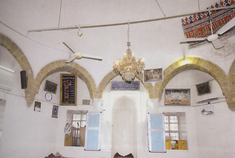 يسقف المسجد قبة نصف كروية محمولة على (١٢) قوساً كبيرة مدببة ترتكز على أظفار مقرنصة، وتضم جدران المسجد (٧) نوافذ مستطيلة الشكل ومحراباً بسيطاً. وهناك أسفل القبة شريط كتابي ملون بالأزرق والأحمر أزيل نصفه، ويضم القسم الباقي منه أسماء الله الحسنى. وفي سمت القبة من الداخل زخارف نباتية يحيط بها شريط كتابي باللون الأبيض ضمن (٦) مجموعات يتناوب فيها اللونان الأزرق والأحمر جاء فيها: «البسملة، وسورة الإخلاص، وأن المساجد لله فلا تدعوا مع الله إلهاً آخر، صدق الله العظيم وصدق رسوله الكريم». ويحيط بالكتابة رسوم لمزررات باللونين الأبيض والأحمر. وقد كسيت القبة من الخارج بصفائح الرصاص.