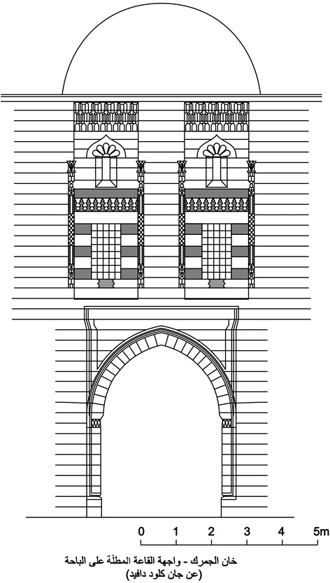تتألف واجهة القاعة المطلة على الباحة من تجويفين يتوجهما مقرنصات. ويضم كل منهما في الأعلى نافذة تضيق واجهتها إلى الداخل (كمرامي السهام)، يعلو فراغها حنية صدفية تتقدمها قوس مفصصة خماسية.