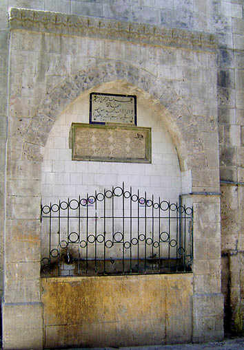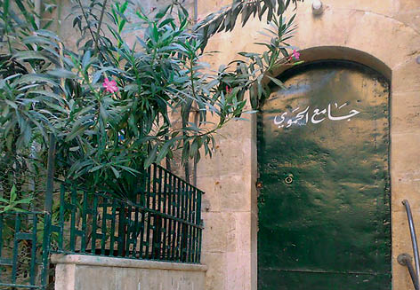 يلي المدخل نافذة الرواق، يليها نافذتا القبلية ثم سبيل الحموي، وهو يبرز عن بقية الواجهة قليلاً، وتتكون واجهته من قوس كبيرة تحدّ تجويفاً قليل العمق يضم جداره نصاً جاء فيه: