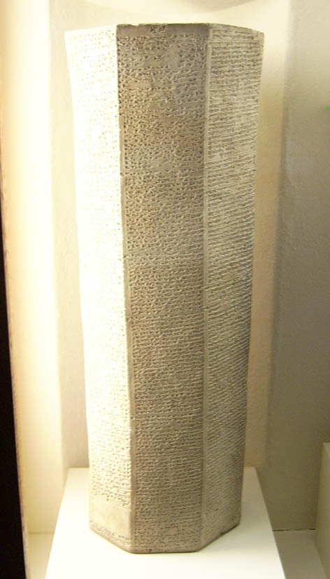 | موشور مثمن من الطين مع نقش تأسيسي للملك تجلات - بلاصر الأول يعود تاريخه إلى ١١٠٩ ق.م عثر عليه في معبد آنو-أدد في بلاد آشور يتناول تقرير أعمال ترميم المعبد | المسلة السوداء لشلمنصر الثالث |