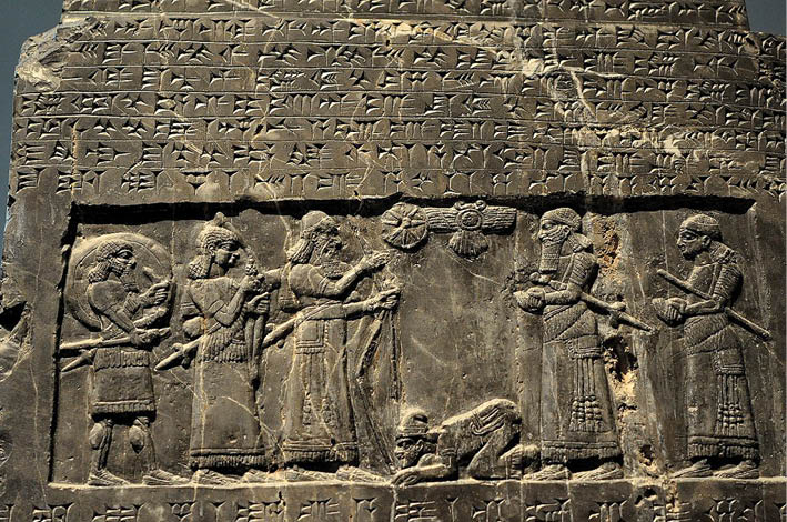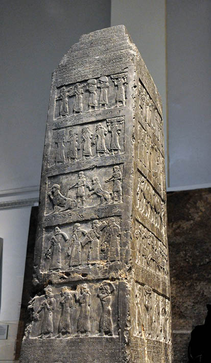| مسلة حجرية تمثل الملك شلمنصر الثالث وتوثق انتصاراته (المتحف البريطاني) |