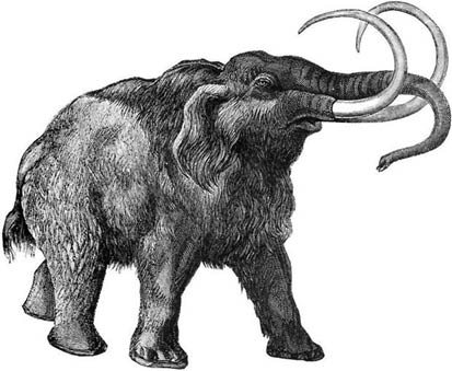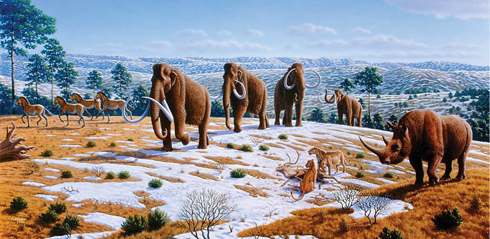 | صورة متخيلة من عصر أواخر البليتوسين في شمالي إسبابنا تظهر فيها خيول برية وماموث صوفي ورنة وأسد الكهوف الأوربي ووحيد القرن | ماموث |
