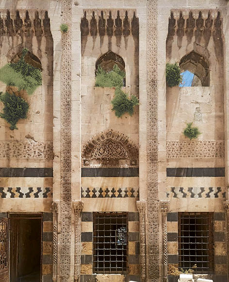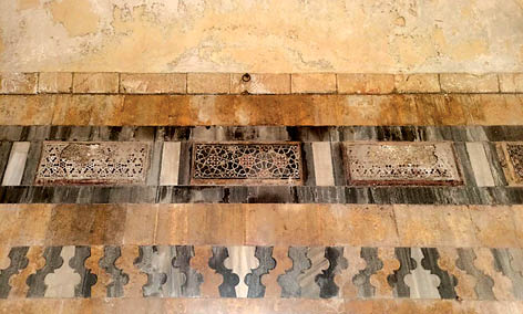 لم تقتصر الزخرفة على الواجهة الخارجية بل هناك لوحات من الفسيفساء الرخامية دقيقة الصنع بأشكال مختلفة ضمن لوحات فوق شريط من المزررات فوق النوافذ داخل الغرف.