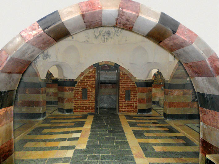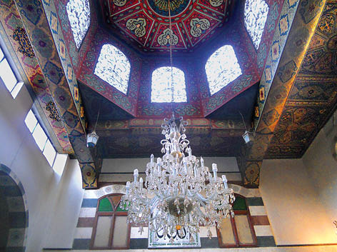 وفي الجدار الشمالي للبراني باب يؤدي إلى الوسطاني الأول الذي مازالت أرضيته الحجرية من الحجر المزي والبازلت في موقعها، وقد أعيدت كسوة جدرانه وأسقفه بالكلسة العربية، وأضيفت في بعض الفراغات في مناطق محددة كسوات جدارية تزيينية من الرخام المشقف.