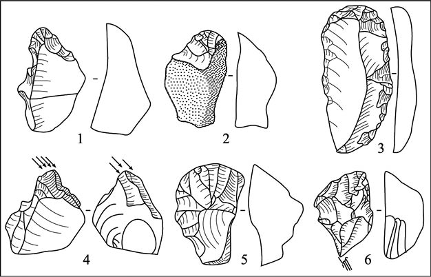 | أدوات حجرية تعود إلى الثقافة الأورينياسية: ١- مكشط بلسان ٢- مكشط بكتف ٣- مكشط مصنع على نصلة مشذبة ٤- إزميل ثنائي السطوح ٥- مكشط سفيني الشكل ٦- أداة مزدوجة مؤلفة من مكشط وإزميل |