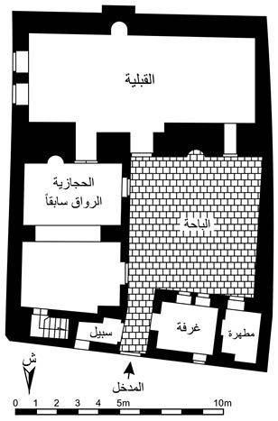يطلّ الـرواق (الحجازية) على الباحة غرباً عبر قوسين كبيرتين ترتكزان على دعامة في الوسط، بني ضمنهما جدار يضم بدءاً من الجنوب: نافذة ثم باباً يؤدي إلى الباحة. ويضم الجدار الجنوبي باباً يؤدي إلى القبلية ثم محراباً تتقدمه قوس مدببة، ويضم الجدار الشرقي نافذتين مستطيلتين علويتين تطلان على الشارع. ويضم الجدار الشمالي بدءاً من الغرب ميضأة، يليها باب أمامه درجات يؤدي إلى درج يصعد إلى الطابق الأول. يسقف الرواق قبوين متقاطعين يستندان إلى ركيزتين كبيرتين، ويكون معلقاً في القسم الأول مما يلي القبلية.