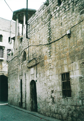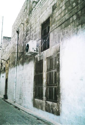 بنيت الواجهة الخارجية الشرقية بالحجارة الصغيرة، وهي بحالة جيدة، وتضم نافذتين كبيرتين مستطيلتين تعلوهما شمسية كبيرة مستطيلة مزودة بقضبان من الحديد المشغول. ويعلو الجميع نجفة (ساكف) مستقيمة قطعة واحدة، وتحت النافذتين عتبة مكونة من قطعة واحدة، ويحيط بالنوافذ الثلاث إطار من الحجارة المنحوتة جيداً يبرز قليلاً عن الجدار. وتنتهي الواجهة بزاوية مشطوفة تعلوها مقرنصة.