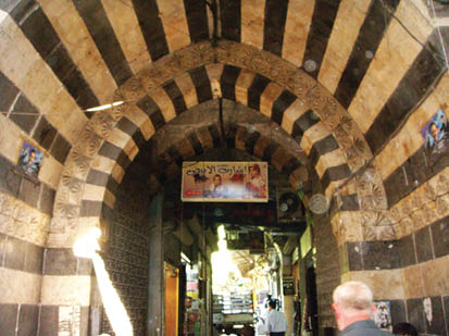 ب- كافل المملكة الحلبية المحروسة أعز الله أنصاره في ربيع الأول سنة عشرين وتسعمائة» (1514م). وتؤدي هذه البوابة إلى ردهة مكوّنة من قسمين تسقفهما قبوتان متقاطعتان، ويفصل بينهما قوس كبيرة مدببة يتناوب في فقراتها الحجرية اللونان الأبيض والأسود، وتتوزع على جانبي الردهة محلات تجارية، وفي الطرف الأيمن درج يصعد إلى الطابق العلوي. وتؤدي الردهة إلى الباحة الرئيسية للخان التي تؤدي بدورها إلى باحة داخلية صغيرة.