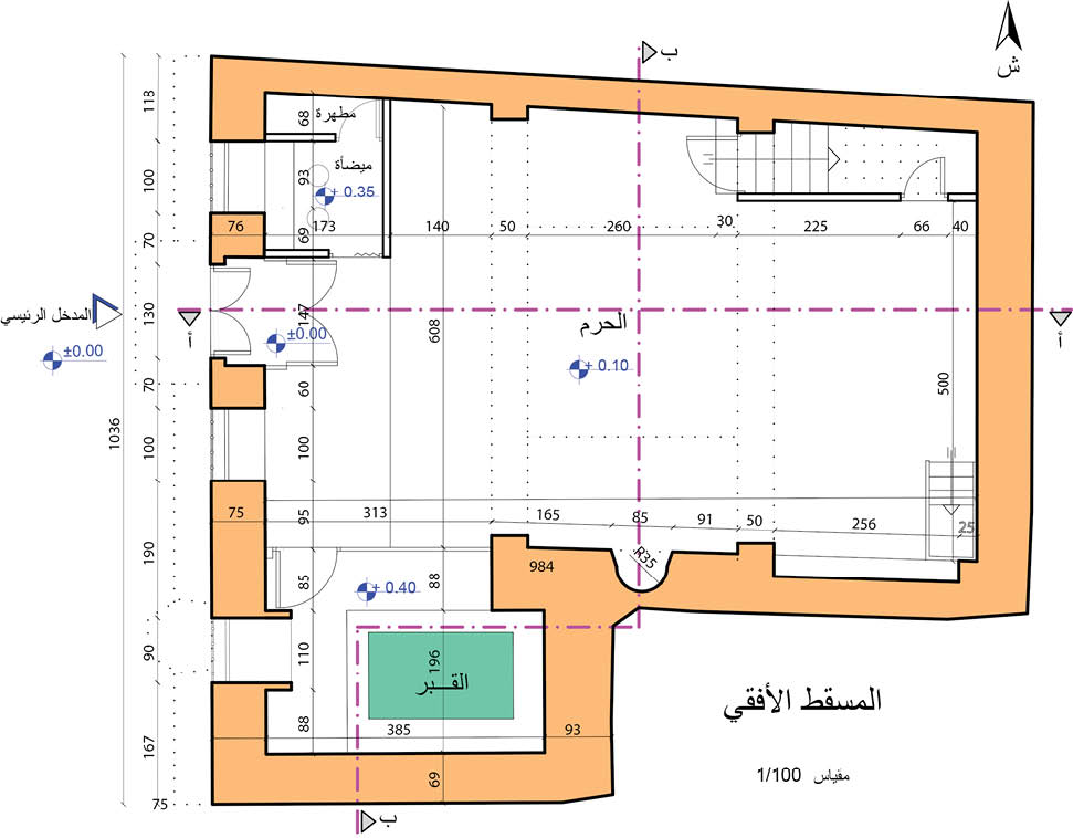 وللمدخل باب خشبي ذو مصراعين يفتح على قاعة الحرم المستطيلة والمؤلفة من ثلاثة فراغات تفصل بينها عقود حجرية بازلتية سوداء مدببة، قد غُطّيت بأسقف خشبية تقليدية، وارتفع سقف الفراغ الأوسط ليشكّل قفّاعة ذات أربع أضلاع، كل ضلع تحوي شباكين زجاجيين يسمحان بالإنارة والتهوية، وقد غطّيت القفّاعة بسقف خشبي أنيق يرتكز على أربعة جسور قطرية لتشكّل سقفاً سنامياً (جملون). وقد استحدثت ميضأة ومطهرة في الزاوية الغربية لواجهة الحرم الشمالية ودرج في الزاوية الشرقية يُصعد عبره إلى سدة مستحدثة.