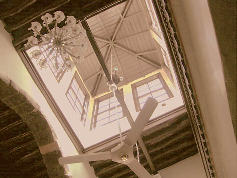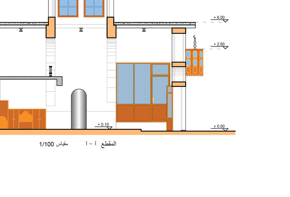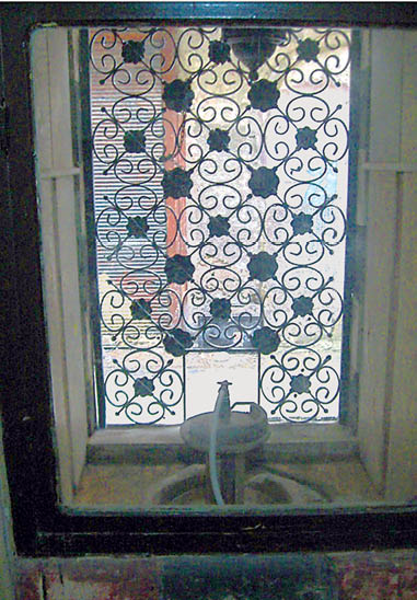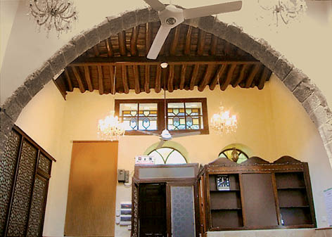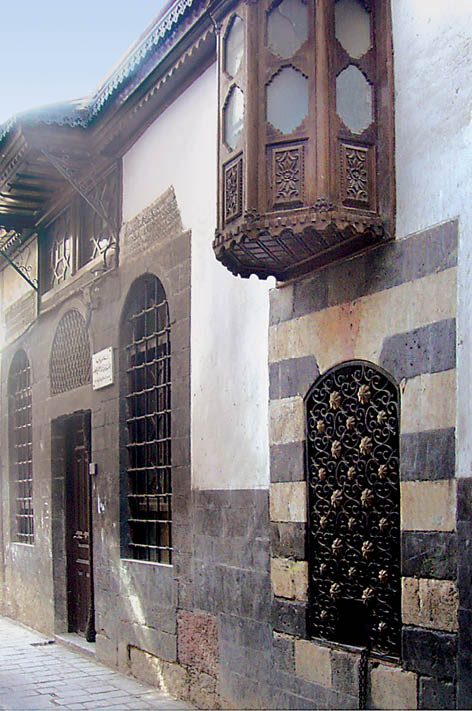 ويعلو واجهة المدخل وعلى محور الباب شباكان بزخارف خشبية مفرغة، وتعلوهما مظلة خشبية برزت عن الطنف المؤطّر للواجهة كلها والمزّين بشرشف معدني مخرّم. وتظهر فوق المظلة جدران القفّاعة المتضمنة شباكين زجاجيين مرتفعين، وقد غُطيت بسقف خشبي سنامي (جملوني).