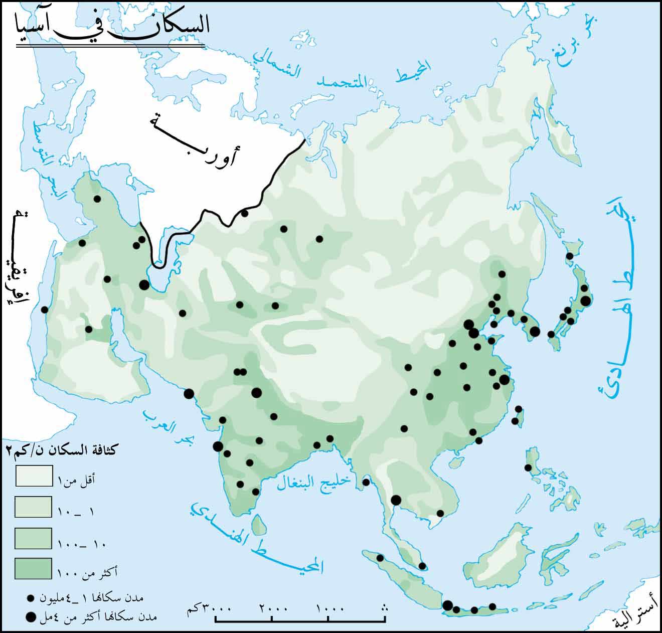آسيا Asia أكبر القارات مساحة (44.6مليون كم2) تشغل نحو ثلث مساحة اليابسة، ويقطنها نحو 60% من سكان الكرة الأرضية، وقامت على أرضها أقدم الحضارات البشرية المعروفة، وهي أكثر القارات ارتفاعاً، إذ يصل معدل ارتفاعها فوق مستوى سطح البحر إلى نحو 950 متراً، أما معدل ارتفاع الأراضي المأهولة بالسكان فيها فلا يتجاوز 320 متراً فوق مستوى سطح البحر.