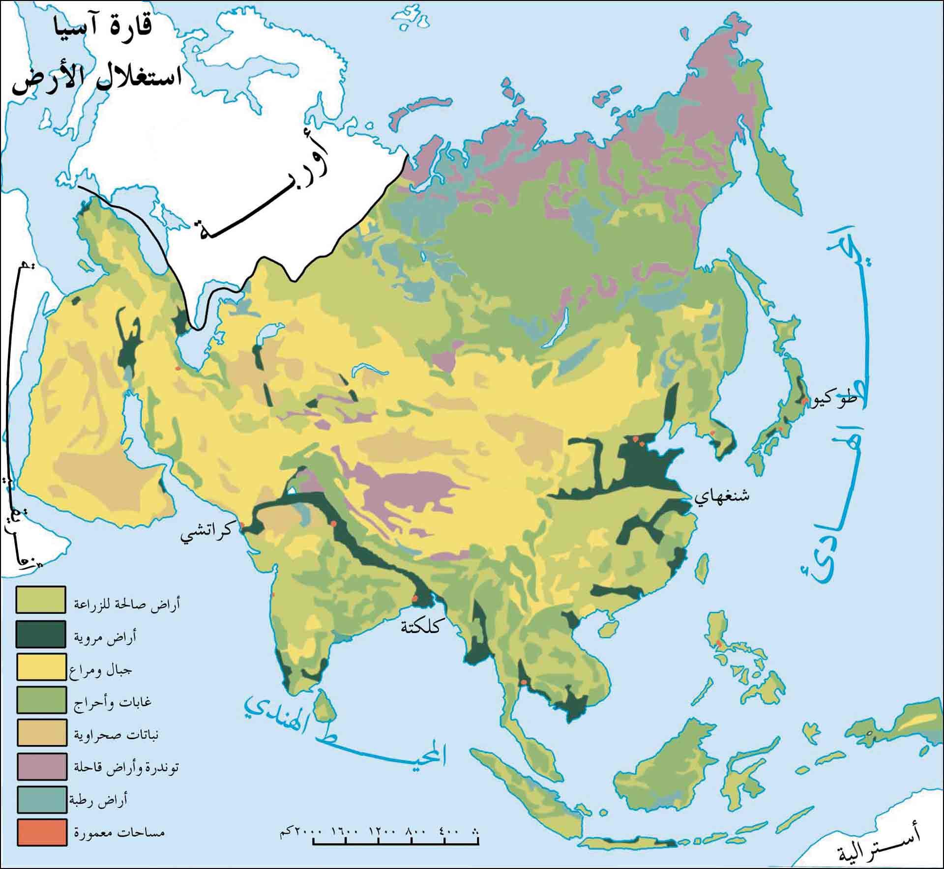 وباستبعاد الأراضي المتجلدة في الشمال الواقعة على خط درجة حرارة 10 درجات مئوية في شهر آب فإن المناطق الآسيوية غير القابلة للاستثمار الزراعي لا تحتل سوى مساحة صغيرة من القارة، ولا تغيِّر المناطق المرتفعة كثيراً في هذا التوزيع، باستثناء الأراضي الجبلية غير المأهولة في آسيا الوسطى والواقعة فوق ارتفاع 4000م فوق مستوى سطح البحر، وفوق حد الثلج الدائم في المناطق الجبلية الموزعة على النحو التالي: