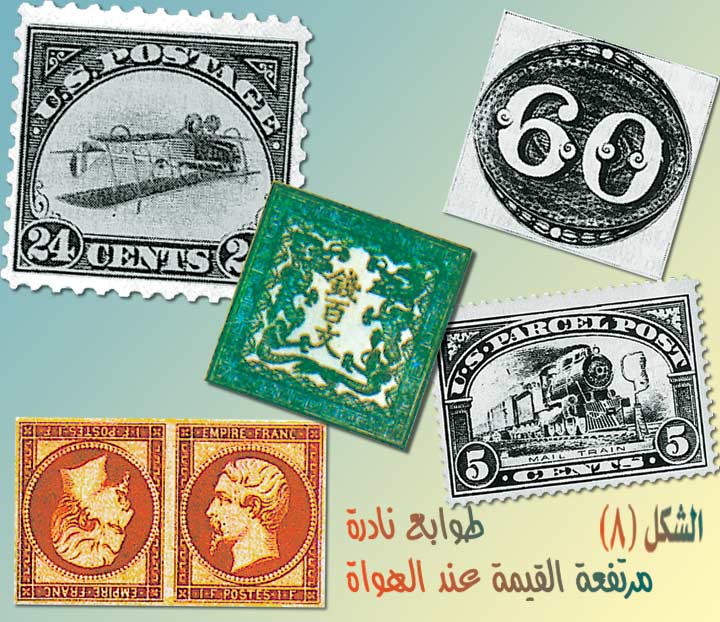(الشكل-8 أ، ب، ج، د، ه) طوابع نادرة مرتفعة القيمة عند الهواة