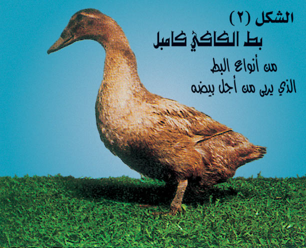 1 ـ عروق البيض: منها العَدّاء الهندي الذي يعد أكثر عروق البط إنتاجاً للبيض، إذ تعطي الأنثى أكثر من 300 بيضة في العام، وكاكي كامبل Kaki Campbell الذي يدين باسمه إلى لونه الأصفر الكاكي، وتعد أنثاه بَيّاضة جيدة (الشكل 2). وأوربنغتون Orpington ذو اللون الأصهب الذي يصل وزنه إلى 3كغ، وتبيض أنثاه نحو 200 بيضة في العام.