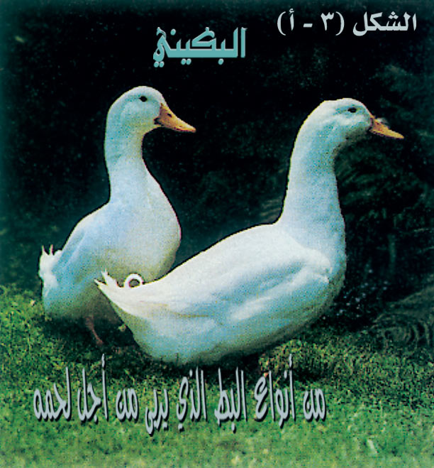 2 ـ عروق اللحم: منها بط رُوان المشهور بإنتاجه من اللحم، وكذلك بجودة هذا اللحم، ويصل وزنه بسهولة إلى 4كغ، والبكيني Pékin وهو بط ضخم لديه قابلية جيدة ويزن الذكر منه 4كغ، والبربري الذي يُسمن من أجل كبده السمين، ويزن البالغ منه 4.5كغ ولحمه جيد، ويستخدم للتهجين (الشكل 3).
