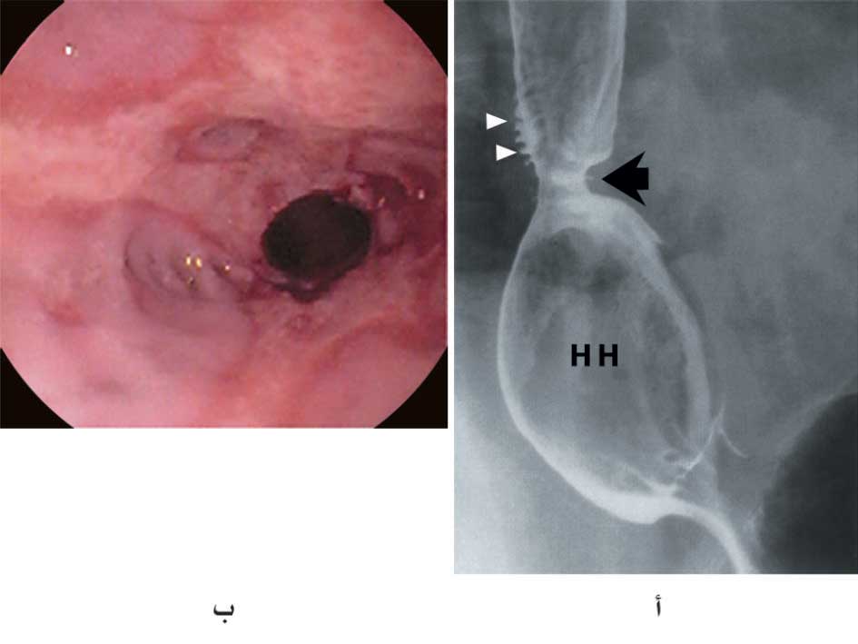 | الشكل (1) أ- تضيق المريء الناجم عن التهاب المري الهضمي كما يبدو في الصورة الشعاعية (السهم الأسود). تكشف الصورة أيضاً وجود فتق حجابي كبير شائع المصادفة في تضيقات المريء الهضمية (HH) إضافة إلى وجود عدة رتوج كاذبة أسفل المريء (الأسهم البيضاء) ب- تضيق المريء كما يبدو بالتنظير الداخلي ويكشف أيضاً التهاب مريء هضمي يشمل كامل محيط المريء (الدرجة IV من تصنيف لوس أنجلوس) |