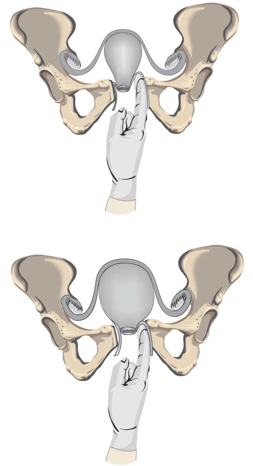 3- وبالمس المهبلي: يشعر بانحراف عنق الرحم نحو الخلف وليونته الشديدة التي تصعب معها معرفته أحياناً. ويشعر (بالقطعة السفلية) من خلال الرتوج بشكل نصف كرة متبارزة في المهبل - وهي مضيق الرحم الذي تمدد في نهاية الحمل - يمكن من خلالها إجراء النهز الرأسي بطريق المهبل كما شعر به بطريق البطن، ويصعب إجراء النهز الرأسي في الشهر الأخير من الحمل ولاسيما في الخروسات لثبات الرأس بتدخله في الحوض في معظم الحالات.