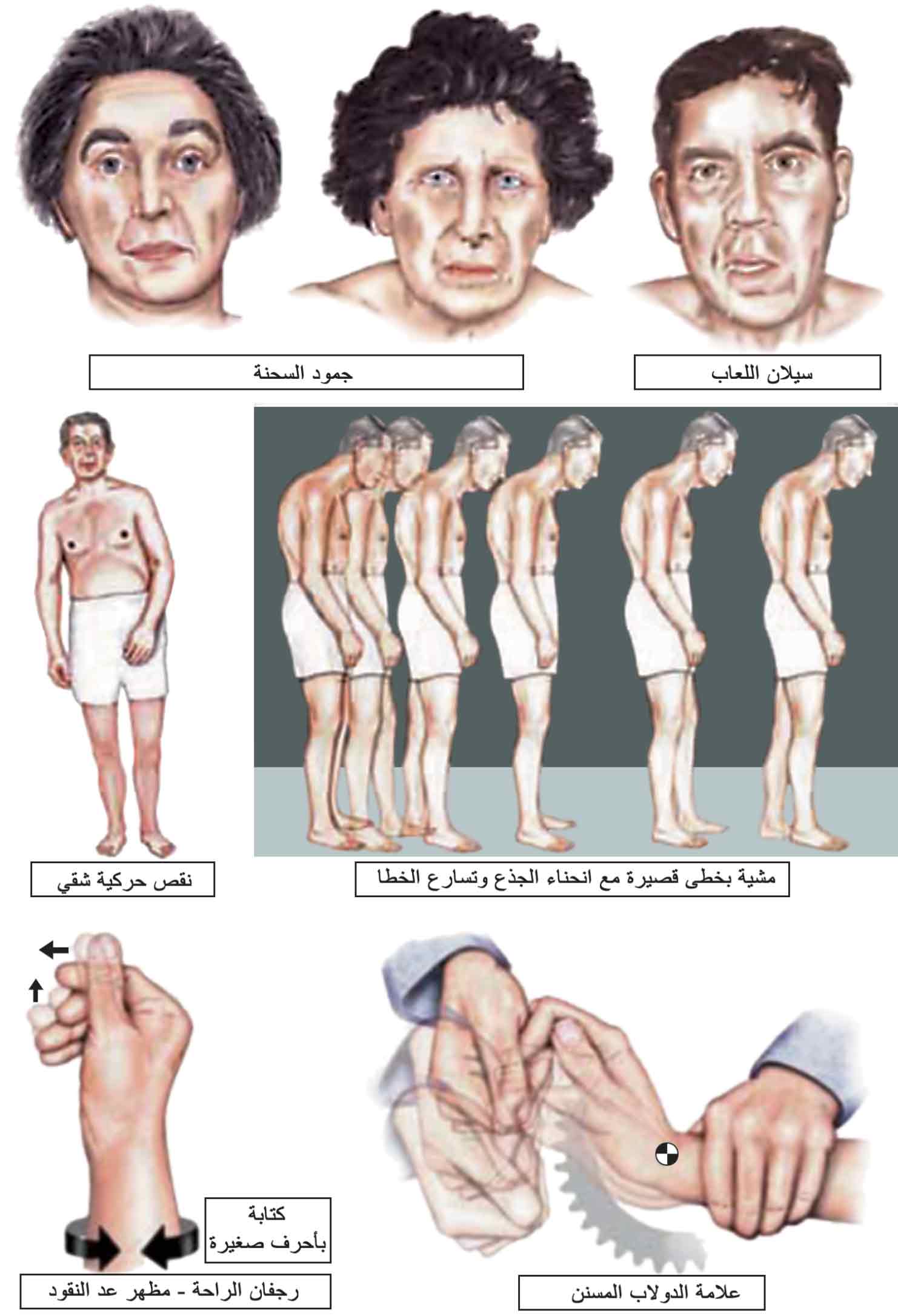 -2 بطء الحركة bradykinesia أو اللاحركية: akinesia يعرَّف بطء الحركة بأنه نقص في الحركات التلقائية غير المبرمجة عادةً والتي تتضح بندرة الحركات وبطئها في الوجـه والجذع (يضطر المريض للتفكير في كل حركة من حركاته)، وندرة عدد مرات الإطباق العيني ورفيف الأجفان ونقص التعابير الوجهية hypomimia و ضعفها أو غيابها (علامة القناع)، واضطراب الحركات الدقيقة وعلى نحو خاص حركة الأصابع؛ إذ يعاني المريض صعوبات في الحلاقة أو الكتابة أو فك الأزرار، ونقص حركة الطرف العلوي وتأرجحه حين المشي؛ مما يعطي الانطباع الخاطئ بوجود خزل شقي، ويفسر التسمية القديمة للمرض «الشلل الرجفاني «paralysis agitans. وكذلك بطء في الحركات الإرادية عموماً وفي الحركات الدقيقة المكررة في الأصابع على نحو خاص.