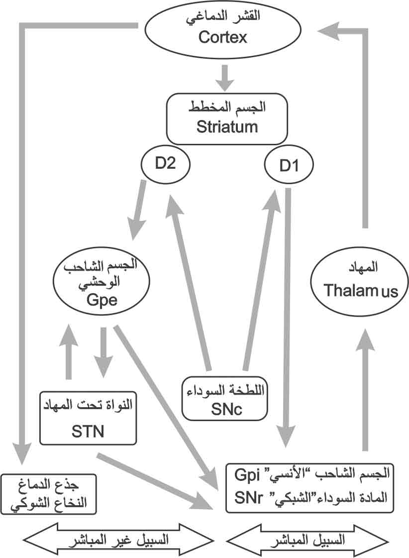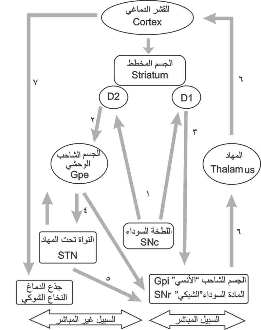 -2 السبيل الثاني هو السبيل غير المباشر تتواسطه بصورة رئيسية تأثيرات دوبامينرجية «مثبطة» تمارس على المستقبلات الدوبامينرجية D2 في الجسم المخطط التي ترسل بدورها سيالات عبر محاويرها؛ لتصل إلى عصبونات القسم الوحشي من الجسم الشاحب GPe مستخدمة الناقل العصبي GABA وترسل هذه العصبونات سيالات عبر محاورها لتصل إلى النواة تحت المهادية STN والتي توفر السيالات الواردة المحرضة التي تصل إلى القسم الإنسي من الجسم الشاحب GPi وإلى الجزء الشبكي من المادة السوداء SNr، ويتواسط هذا التأثير المحرض الناقل العصبي «غلوتامات». يتألف القسم الأخير للسبيل غير المباشر من عصبونات القسم الإنسي للجسم الشاحب، وهي «غابائيرجية»، وترسل سيالاتها عبر محاويرها للمشابك الموجودة في النواة البطنية الجانبية للمهاد، والسيالات المرسلة من العصبونات المهادية والواصلة للقشر الحركي تكون من النوع المحرض (الاستثاري) excitatory. في الشكل الترسيمي تم الترميز للسيالات المحرضة باللون الأخضر وللسيالات المثبطة باللون الأحمر (الشكل 1).