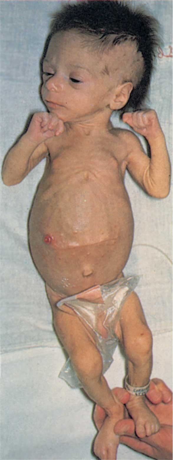 الشكل (1) تليف كيسي لدى وليد. يلاحظ المظهر الهزيل والبطن المنتفخ الذي أعقب التداخل الجراحي من أجل الانسداد بالعقي (علّوص العقي)، إذ إن العقي في الداء الليفي الكيسي يكون لزجاً بصورة غير طبيعية مما يؤدي إلى انسداد الأمعاء والتهاب الصفاق |