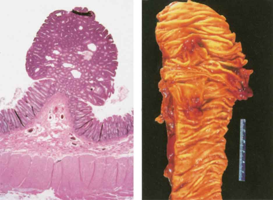 | الشكل (1) السليلات القولونية تشكل تبارزات داخل اللمعة (في الأيمن) وتتألف من تكاثر أنبوبي لظهارة الغدد هيستولوجياً ( في الأيس) |