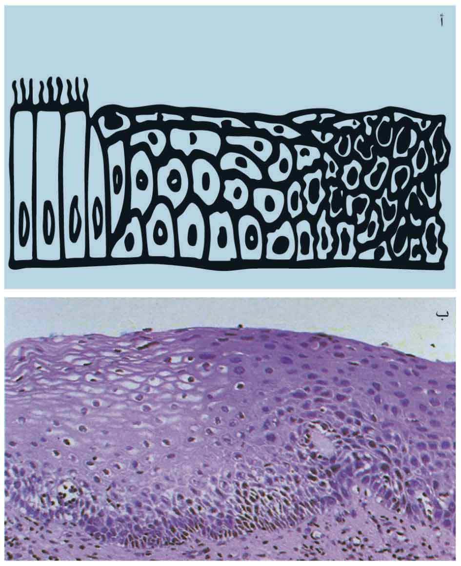 | الشكل (3) خلل التنسج: أ- بشرة قصبية مصابة بالحؤول وخلل التنسج. ب- خلل التنسج في عنق الرحم (الجزء الأيمن من الظهارة). |