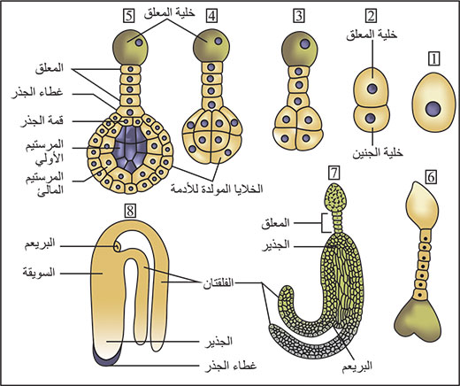 الشكل(1) مراحل التنامي الجنيني في مغلفات البذور ثنائيات الفلقة. |