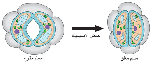 الشكل (11) إغلاق المسام في أثناء الإجهاد الناتج من الجفاف بتأثير حمض الأبسيسيك. |