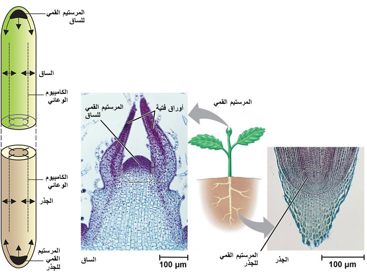 - التنامي ما بعد الجنيني الذي يعقب عملية إنتاش البذرة seed germination، والذي يؤدي إلى بناء الشكل النوعي للنبات (الشكل 2)، ويمثل نِتاج نشاط الخلايا المرستيمية الابتدائية primary meristems الموجودة في قمتي الجذر والساق، إضافة إلى المرستيم الثانوي secondary meristems في كل من عاريات البذور وثنائيات الفلقة من مغلفات البذور الذي يكون في مناطق محيطية من الجذر والساق.