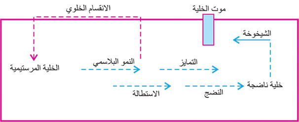 يوضح الشكل (4) تمثيلاً بيانياً لتسلسل العمليات التي تبدأ من الخلية المرستيمية لحظة تشكلها حتى شيخوختها ومن ثم موتها، وهذا ينطبق أيضاً على جميع النسج والأعضاء النباتية.
