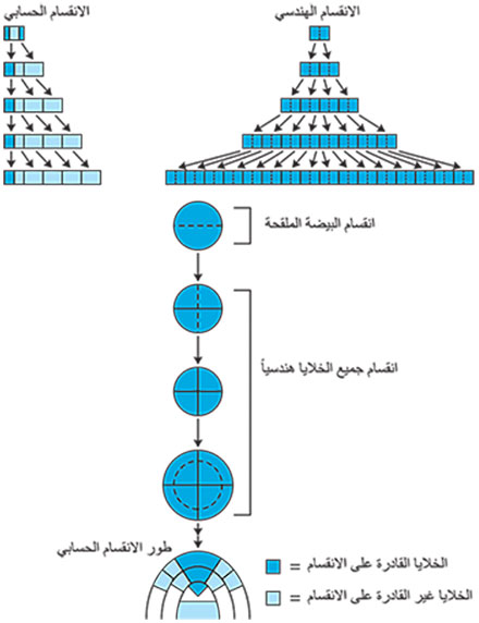 | الشكل (5) تمثيل بياني للنمو الحسابي والهندسي والمراحل في أثناء نمو الجنين التي توضح الانقسام الهندسي والحسابي. |