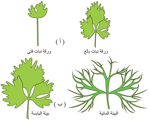 | الشكل (6) تغاير الأوراق في نبات (أ) العائق Delphinium و (ب) في الحوذان .Ranunculus |