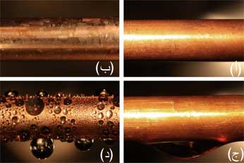 الشكل (6) قضيب معدني عولج ليصبح غير قابل للتبلل. (أ) غير معالج، (ب) معالج بالكرافين، (جـ) التكاثف على النوع غير المعالج، (د) التكاثف على القضيب المعالج. |