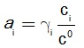 و معامل الفعالية، وهو أيضاً مقدار بلا واحدة ويُعبر عن مدى ابتعاد سلوك المحلول المدروس عن المحاليل المثالية، وهو يساوي الواحد في حالة المحاليل المثالية. و Ci التركيز المولي للنوع المدروس مقدراً بالـ