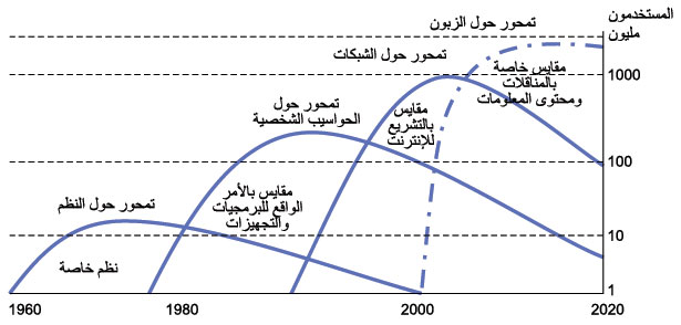 يستدعي توقع ما سيحدث في المستقبل معرفة التطور التاريخي لمجريات الأمور، والمتتبع لتاريخ تقانات المعلومات والاتصالات وانتشارها يجد أنها مرت بمراحل أو موجات تطور متعاقبة (الشكل1). فقد بدأت المرحلة الأولى مع سيطرة النظم المعتمدة على الحواسيب الضخمة mainframes والحواسيب الصغيرة minicomputers المتاحة في مراكز الحوسبة المركزية لنخبة من الأفراد والمجموعات، وعدت هذه المرحلة مرحلة النظم التي سادت فيها التجهيزات الخاصة. أما المرحلة الثانية فامتازت بانتشار المعالجات الصِّغرية والحواسيب الشخصية، ولم تعد الحواسيب حكراً على النخبة بل أصبحت متاحة للأفراد والمستخدمين وموجهة للجميع. في هذه المرحلة سيطرت مجموعة من معايير الأمر الواقع التي فرضتها الشركات المصنعة، وعرفت باسم المعيار وينتل Wintel (المشتق من نظام التشغيل ويندوزWindows والمعالج إنتلIntel ). ظهرت المرحلة الثالثة عندما طورت مجموعة طلاب في جامعة إيلينوي برنامج "موزاييك"؛ وهو أول متصفح للشابكة (الإنترنت) في عام 1993، وتحولت الإنترنت بسرعة من شبكة خاصة بالنخبة من الباحثين إلى ظاهرة شعبية، وتبع ذلك دعم مايكروسوفت للربط الشبكي في نظم تشغيلها، وأصبحت الحواسيب عقداً في الشبكة بدلاً من أن تكون جزراً مستقلة؛ مما ترك آثاراً واضحة في تصميم التطبيقات الحاسوبية.