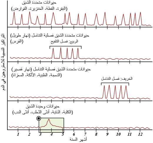 تجدر الإشارة إلى أنَّ بعض الحيوانات يمكنها التزاوج؛ أو يظهر عندها النشاط التناسلي على مدار العام، فمثلاً البقر والجواميس والخنازير لها القدرة على التزاوج خلال فترات الشبق التي تظهر على مدار السنة؛ فتسمى بحيوانات متواصلة أو مستمرة الشبق continuous estrus (الشكل 1)، وهذا ما يميِّزها من غيرها من الأنواع الحيوانية التي يظهر عندها الشبق عدة مرات؛ لكن ضمن فصل أو وقت محدد من السنة؛ فتسمى بالحيوانات فصلية التناسل متعددة الشبق seasonal polyestrus. مثال ذلك بعض سـلالات الغنم والمعز التي يظهر نشاطهــا التناسلي مـع بداية نقص الفترة الضوئية أو النهار مـن العام short day breeds، والخيول التي يبدأ نشاطها التناسلي مع بدء زيادة الفترة الضوئية أو طول النهار من العام long day breeds. كما تتميز أنواع أخرى من الحيوانات بأنّها فصلية التناسل لكن لا يظهر الشبق عندها إلا مرة واحدة، لهذا تسمى بالحيوانات فصلية التناسل وحيدة الشبق seasonal monoestrus (الشكل1)، مثال ذلك الكلبة؛ إذ تظهر شبقاً مرتين في العام؛ مرة في الربيع؛ وأخرى في الخريف؛ وبذلك يكون طول دورة الشبق عندها 6 أشهر، وفي حال حدوث حمل لايظهر الشبق ثانية إلا بعد قدوم الفصل التناسلي التالي. ومما لا شك فيه أنّ بعض العوامل البيئية مثل الإضاءة والحرارة والتغذية - إضافة إلى الجينات - قد تؤثر تأثيراً كبيراً جداً في النشاط التناسلي وفي العمر الذي تبدأ فيه هذه النشاطات الجنسية بالظهور ضمن الأنواع الحيوانية المختلفة وبين أفرادها.