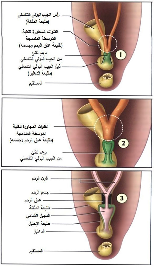 الشكل (10) انصهار قناتي مولر مع الجيب البولي التناسلي وتشكل الرحم والمهبل.
