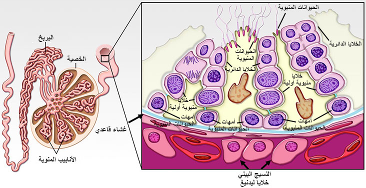 الشكل (18) دورة النسيج المنوي في الثيران ومراحل تطور النطف. |