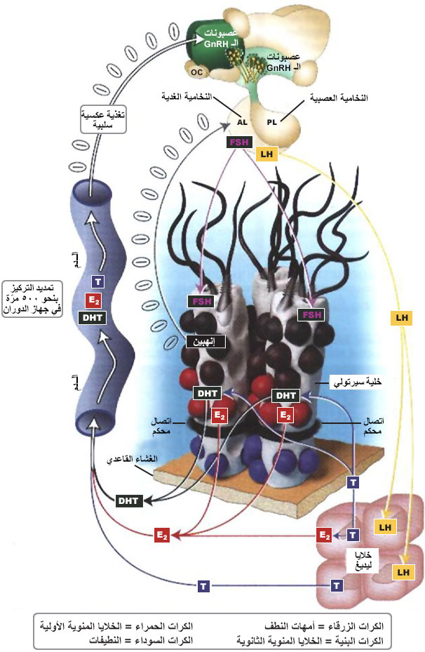 ونظراً لعدم تطور المركز الذروي surge center لإفراز الـ GnRH في المهاد عند الذكور؛ فإن إفرازه في الذكور البالغة يظهر بشكل اندفاعات متقطعة قصيرة (عدة دقائق) ومستمرة خلال الليل والنهار مسببة إفراز الـ LH بشكل ذروات متسلسلة ولاحقة، وأعلى من نظيراتها الخاصة بالـGnRH (الشكل15-أ). وتستغرق كل ذروة من ذرا الـ LHعادة نحو 10-20 دقيقة، وتحدث بمعدل 4-8 مرات/ يوم. تستجيب خـلايا ليديـغ لـ LH بإفراز التِّستوستيرون بشكل ذرا عالية متلاحقة ومتسلسلة بعـد مرور 30 دقيقة من كل اندفاع خاص بهرمون الـ LH (الشكل 15-ب). أما مستوى إفراز الـ FSH فيكون أقل بسبب التأثير السلبي للإنهِبين في إفراز الـ FSH، ولكن تكون ذراه أعرض من ذرا الـLH بسبب زيادة طول فترة حياة الـ FSH. وتبين أن إفراز الـ LH بشكله النبضي المتكرر الدائـم والقصيـر المدى (10-20 دقيقة) يُعدّ ضرورياً لسببين: أولهما المسـاعدة على إفراز التِّستوستيرون وتراكمه على مستوى الأنيبات المنوية بتراكيز أكبر بنحو 100-150 مرّة من مستواه في الدم؛ مما يجعله ضرورياً لاستمرار عملية تكون النطف، وثانيهما أن خلايا ليديغ تصبح رافضة (حرونةً) refractory لهرمون الـ LH بسبب انخفاض عدد مستقبلاته على سطحها؛ ولهذا يظهر انخفاض بمستوى التِّستوستيرون عندما يكون مستوى الـ LH عالياً، والعكس صحيح. كما تبين أن التِّستوستيرون المفرز خارج الخصى يتمدد بنحو 500 مرّة عندما يصل إلى الدم؛ مما يجعل تركيزه في الدم الجهازي منخفضاً، فيقلل من أثر التغذية العكسية السلبية في إفراز الـ GnRH، والـ LH على مستوى الوطاء والنخامية الغدية؛ على التوالي.