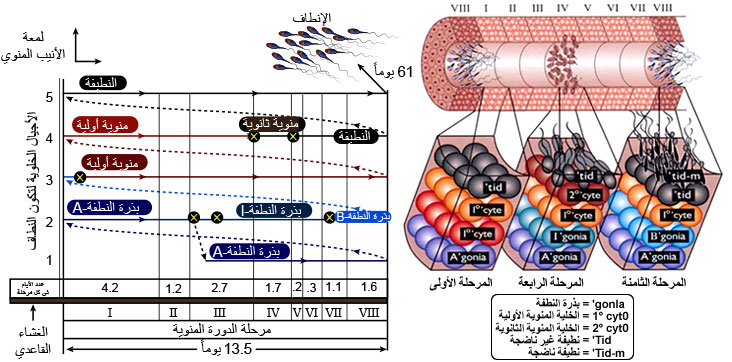 استطاع العلماء من خلال التغيرات التي تطرأ على الجسيم الطرفي، وعلى النواة، وأماكن توضع الخلايا ضمن الأنيب المنوي تمييز 14 مرحلة متباينة التطور عند الجرذان، و8 مراحل مختلفة في طولها ومتباينة في تطورها عند الثيران، و6 مراحل عند الإنسان، وفي كل مرحلة 5 أجيال، ولا تتحرر كنطف في لمعة الأنيب المنوي إلا بعد اجتيازها الجيل الخامس من المرحلة V111 قاطعة مراحل التطور كافة. كما وجد أن دورة النسيج المنوي بأكملها وبدءاً من المرحلة 1 حتى المرحلة V111 تحتاج إلى وقت يختلف باختلاف الحيوانات الزراعية، مثلاً 13.5 يوماً عند الثيران.
