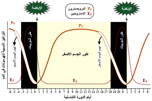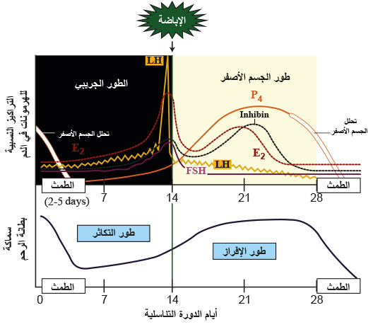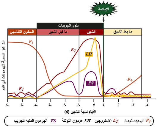 E2: الإستروجين، P4: البروجِسترون، FSH:الهرمون الموجه لنمو الجريبات المبيضية، هرمون: LH