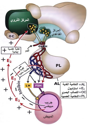الشكل(5) العلاقة بين الوطاء والنخامية الغدية والمبيض خلال الطور الجريبي في الحيوانات الزراعية. |